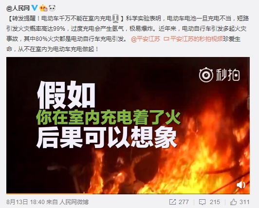 人民网:转发提醒!电动车千万不能在室内充电